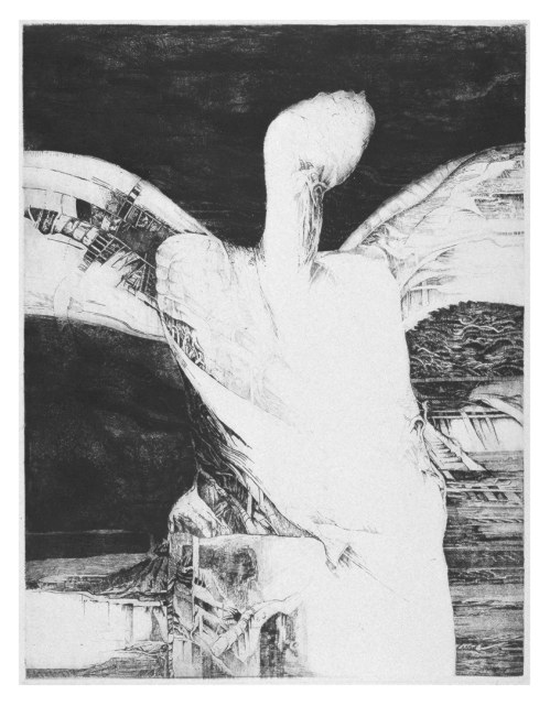 "Anioł" 1974 rok, akwaforta, akwatinta, format 65 x 50 cm. nakład 50 szt. II nagroda w Konkursie na Grafikę Roku GTPS 1974