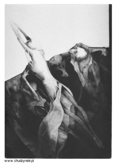 "Jedyne właściwe wyjście" 1981 rok, sucha igła, format 35 x 24 cm. nakład 25 szt.