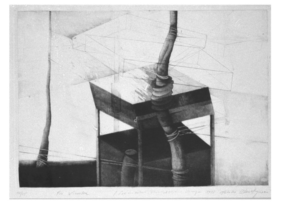 "Pro Vizorka" 1987 rok, sucha igła, akwatinta, akwaforta, format 35 x 50 cm. nakład 25 szt. I nagroda w konkursie na Grafikę Roku GTPS 1987r.