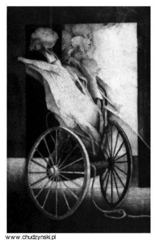 "Jazda" 1981 rok, sucha igła, format 25 x 16 cm. nakład 25 szt. Wyróżnienie w Konkursie na Grafikę Roku Polski Północnej 1981 r.