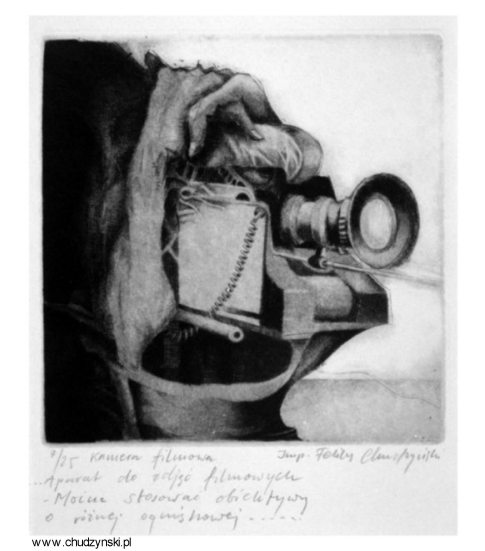 "Kamera Filmowa" 1982 rok, sucha igła, format 17 x 17 cm. nakład 25 szt.